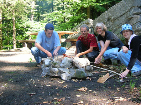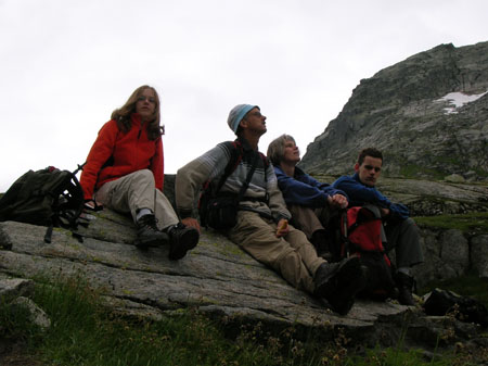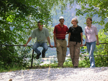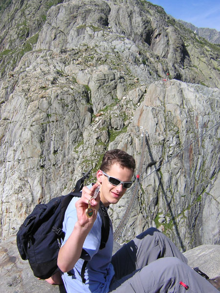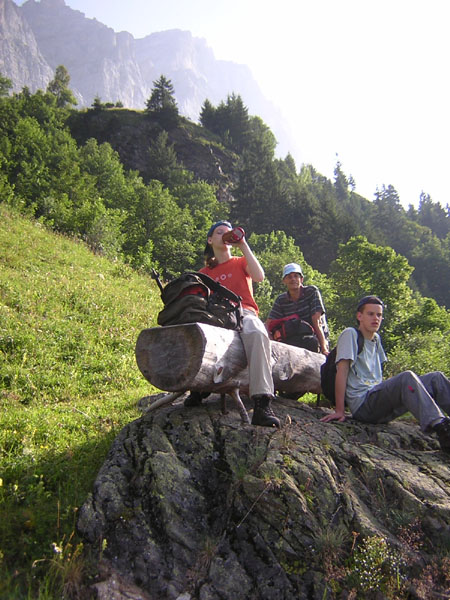 groepsfoto Zomervakantie in het Haslital, voor iedereen de eerste keer. Ook zónder kinderen zijn we hier zelden geweest. Het is een vakantie van uitersten. Twee dagen continu regen, maar dan ook echt continu. En een werkelijk fantastische tocht naar (en over) de Triftbrücke. Een enorme kudde gemzen bij de Lauteraarhütte. Zeker niet mislukt, die vakantie van 2005 maar toch ... Meiringen is nét niet ‘bergs’ genoeg en we hebben veel in de auto gezeten. |